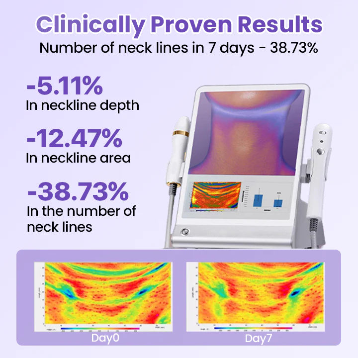 Sem agulhas, sem cirurgia, sem procedimentos invasivos — obtenha rejuvenescimento de pele de nível de spa no conforto da sua casa! Estudo clínico de 7 dias | 1.000 participantes | Todos os tipos de rugas no pescoço A análise avançada da pele VISIA confirmou resultados notáveis em apenas uma semana: