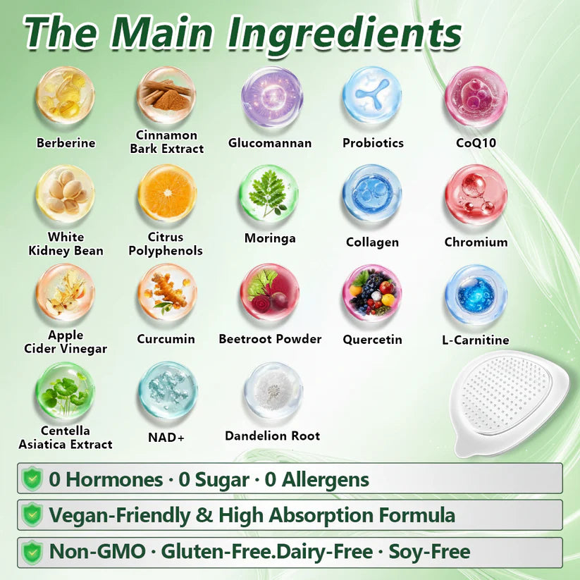 ✅ Benefícios adicionais: Este líquido pode tratar diversas complicações relacionadas à obesidade, como doenças cardiovasculares, diabetes tipo 2, artrite, obesidade/hipertensão, fígado gorduroso, recuperação da função hepática, névoa mental e declínio da memória, além de problemas de saúde feminina, incluindo desequilíbrios hormonais, sintomas da menopausa e problemas vaginais como coceira e odor.