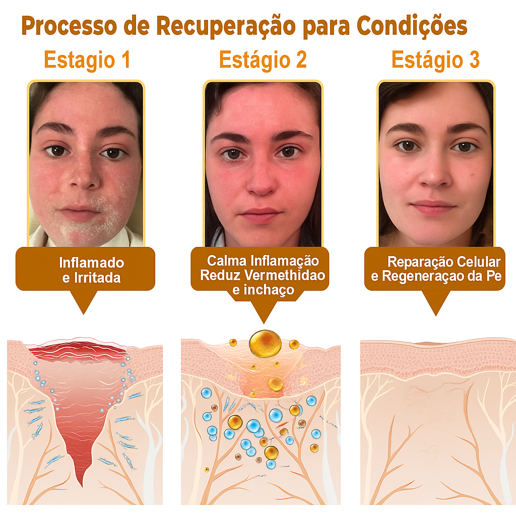 Compostos exclusivos na fórmula quebram o ciclo de inflamação crônica em sua origem, permitindo que sua pele finalmente se cure em vez de lutar constantemente contra si mesma.