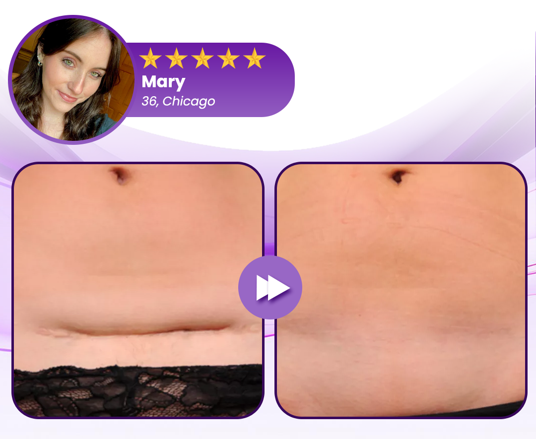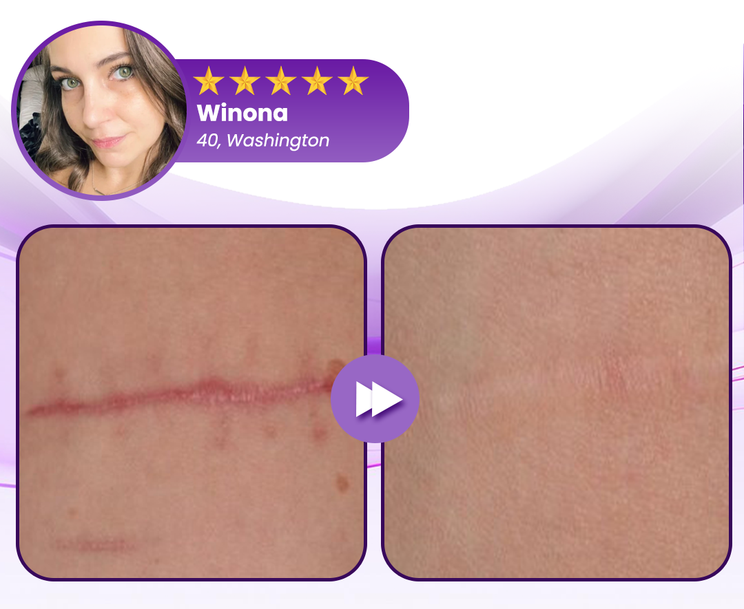 "Depois da minha cesárea, fiquei com uma cicatriz grossa na parte inferior do abdômen. Ela sempre me deixou tensa e insegura. Comecei a usar o LAOZIK™ RevivaDerma e, em poucas semanas, notei mudanças significativas — a cicatriz ficou mais macia, menos vermelha e muito mais lisa. Agora, é quase imperceptível, e me sinto muito mais confiante com a minha pele novamente. Este gel tem sido uma verdadeira salvação-vidas na minha jornada de recuperação." -Maria, 36, Chicago